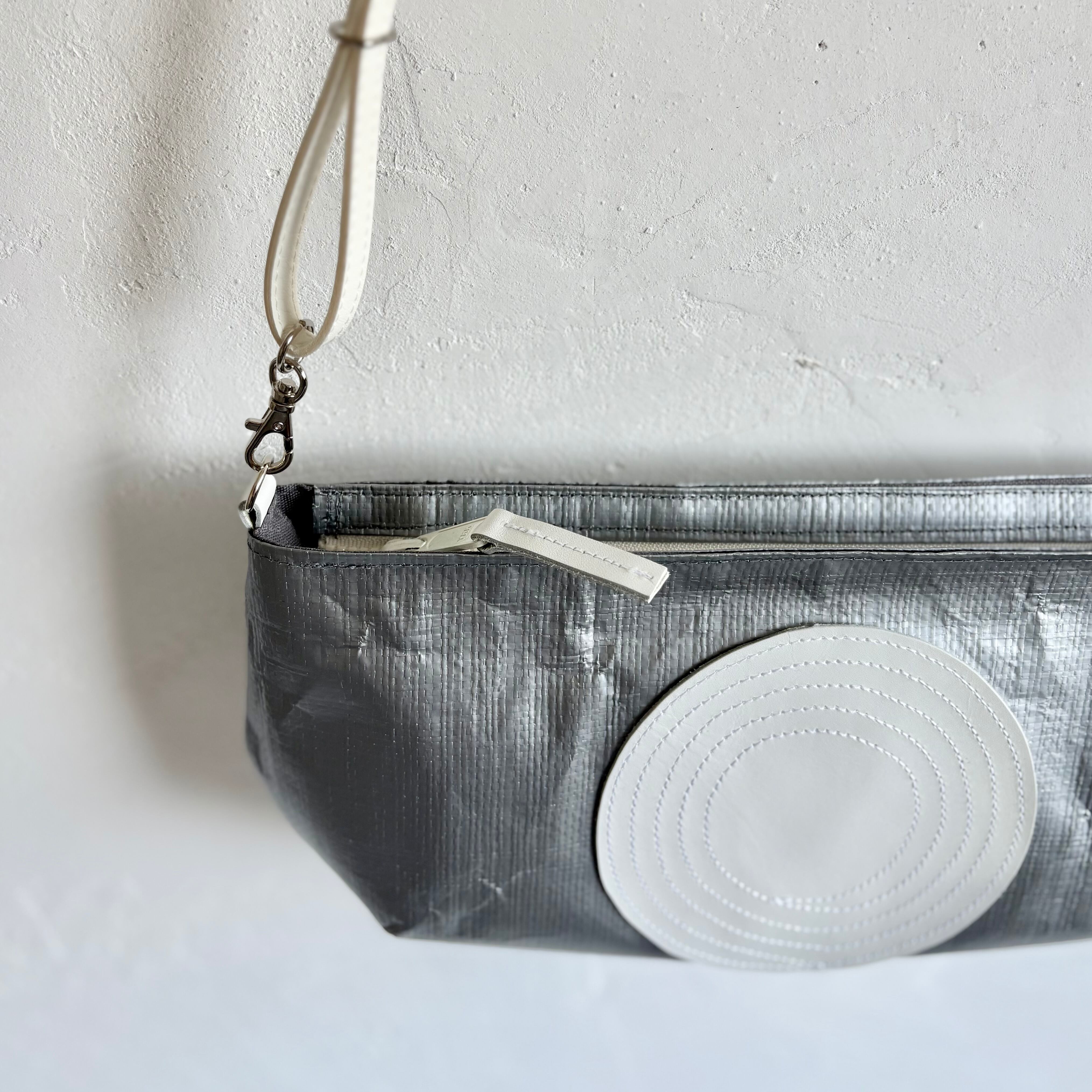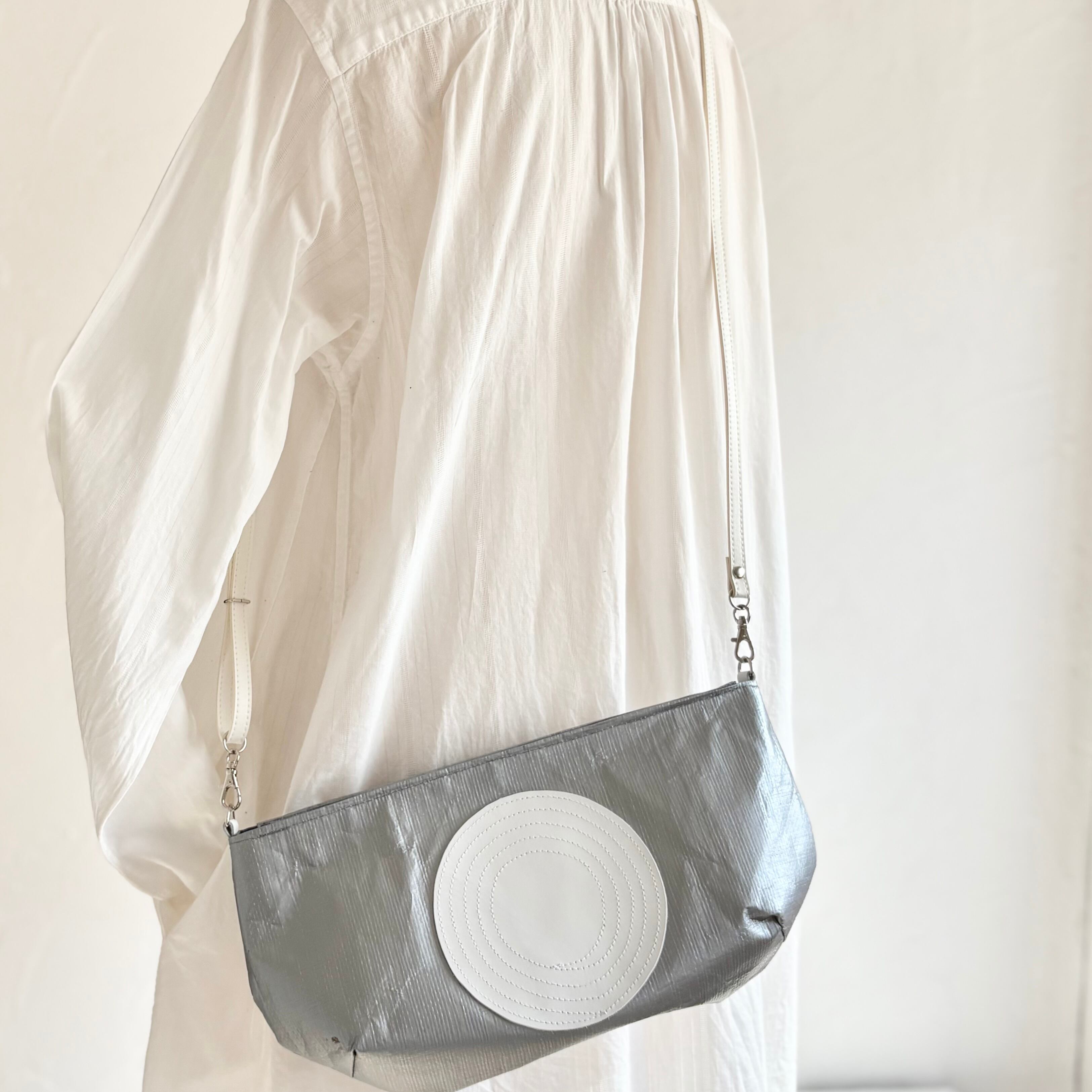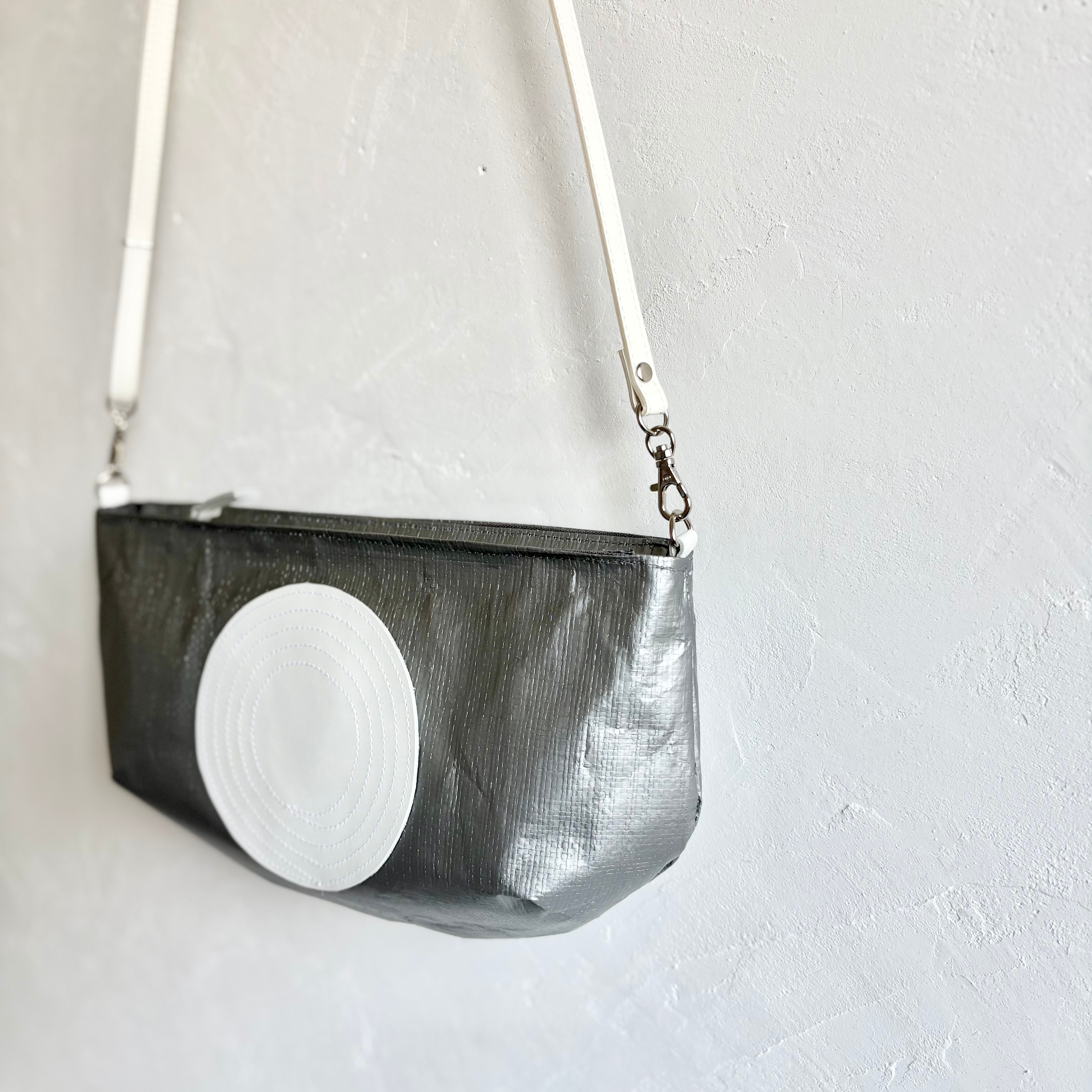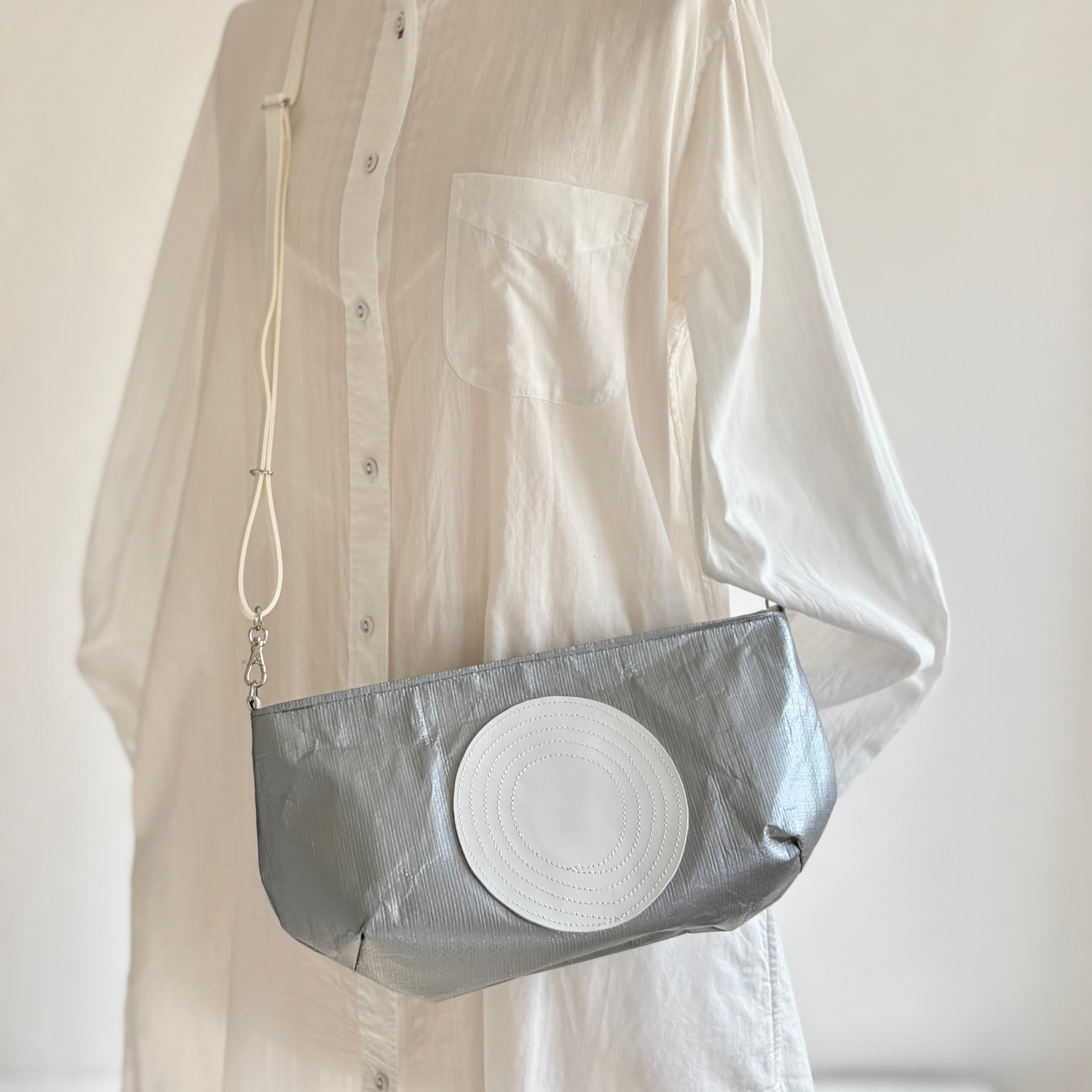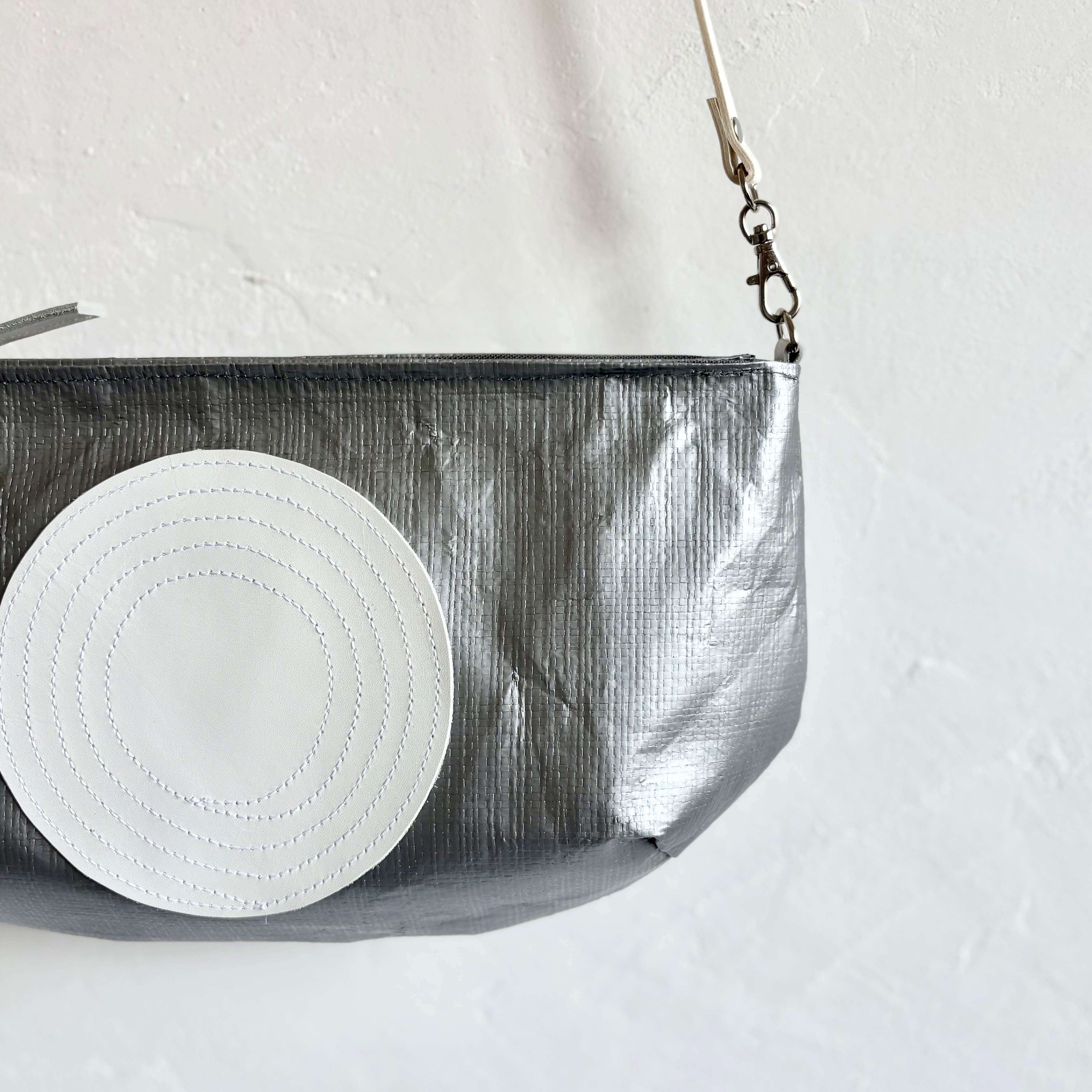 シンプルな中に、白い革の丸モチーフでアクセントを。