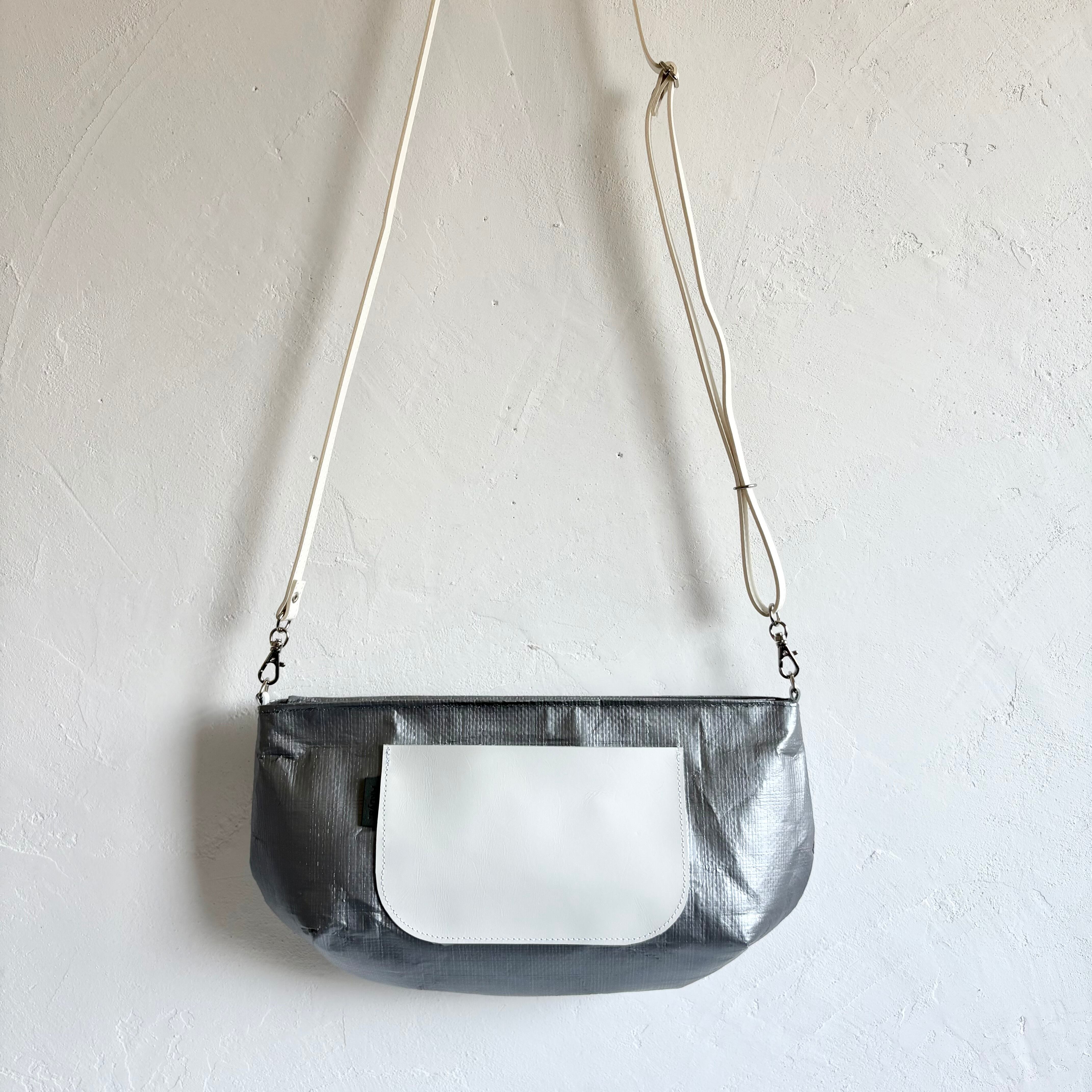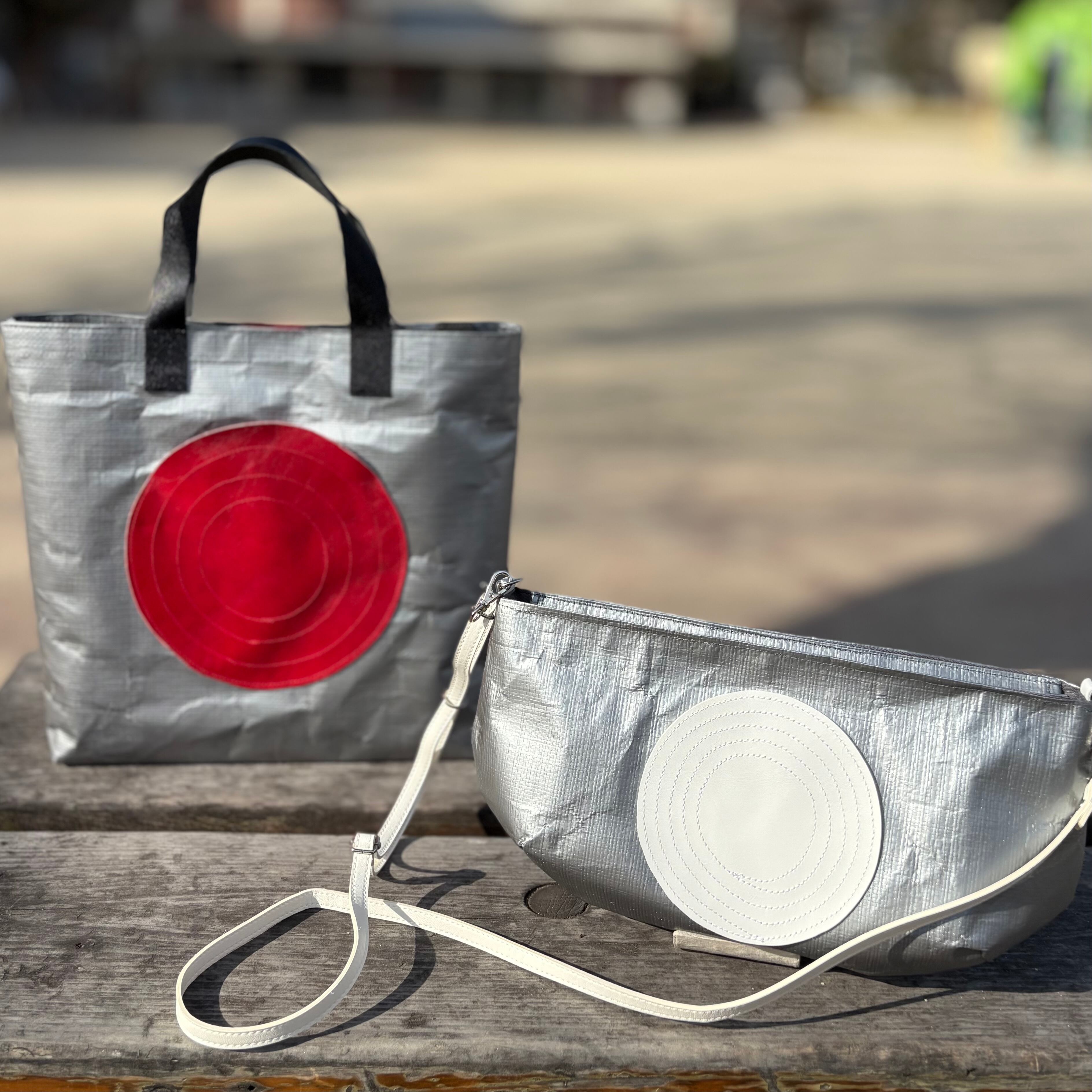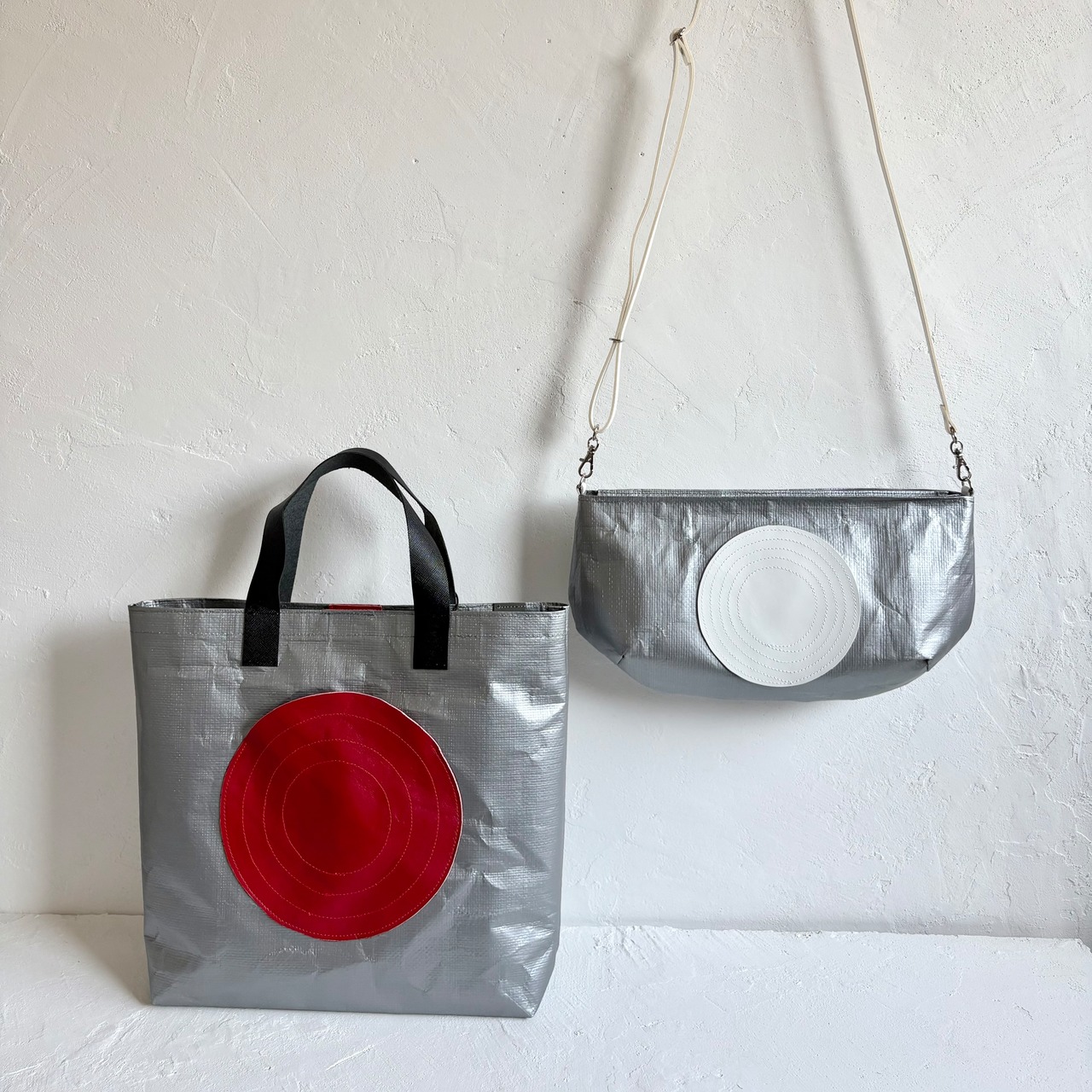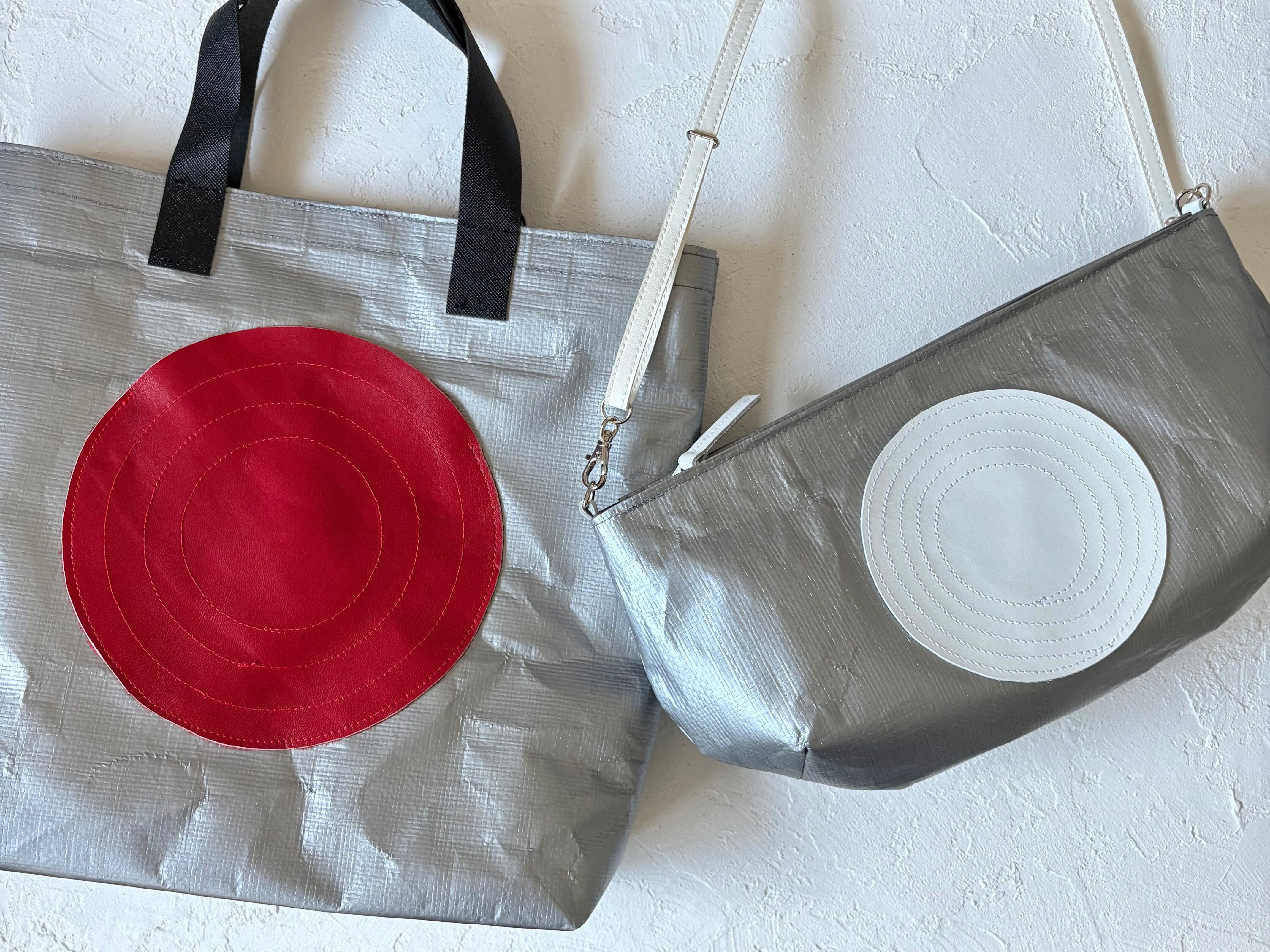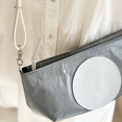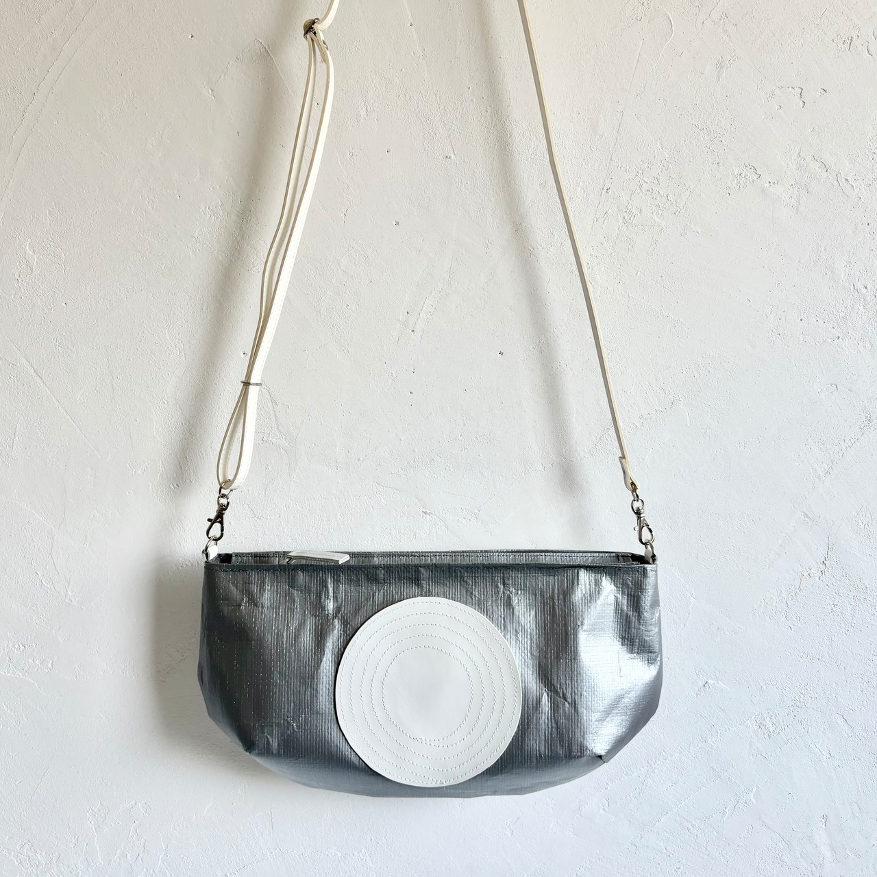 シンプルな中に、白い革の丸モチーフでアクセントを。