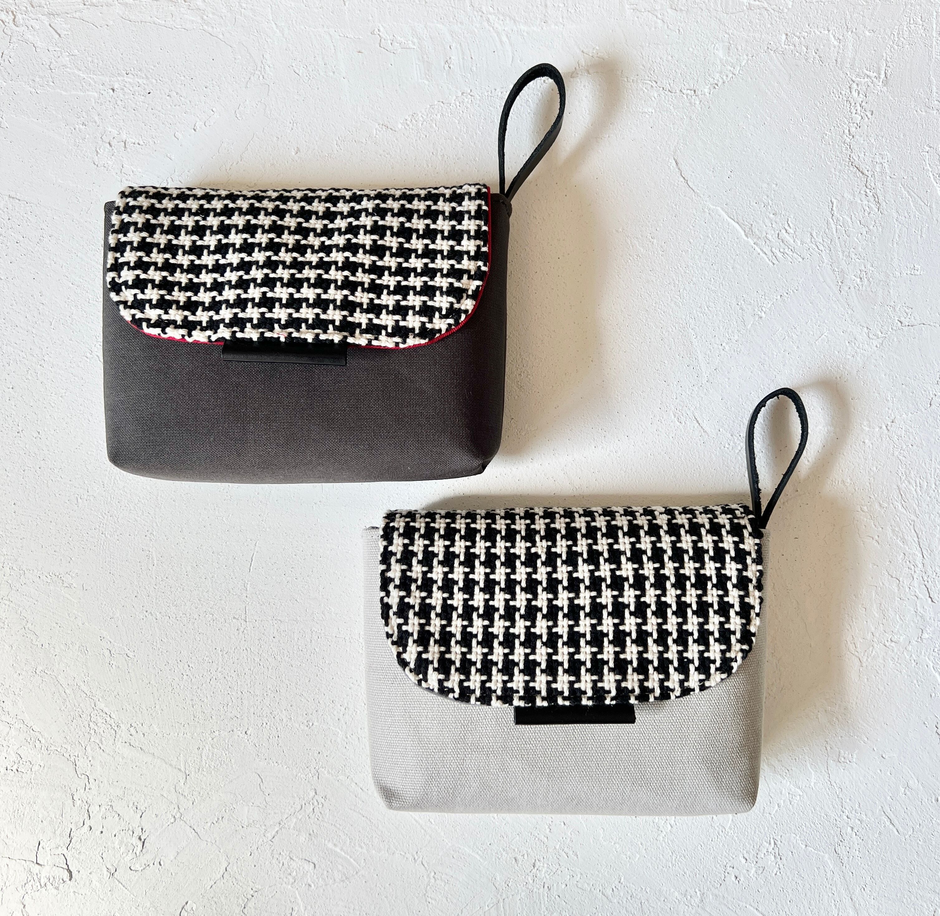 蓋には黒と白の綿糸で織り上げた「千鳥格子織り」が引き立つモノトーンのポーチです。